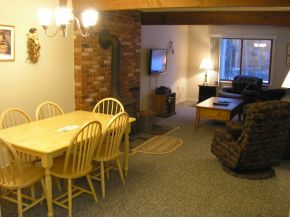 Recently upgraded 2 BR, 2 full bath condo with livingroom, fully equipped kitchen and dining area. Unit sleeps up to 6 - queen bed in master bedroom, 2 twin beds in 2nd bedroom and a queen sleep sofa in the livingroom. Main level unit with a ground-level deck allows easy access to a private, level yard for summer or winter use. The unit has a master bedroom suite with bath, open living/dining area with a wood stove for winter use and air conditioning for the summer.